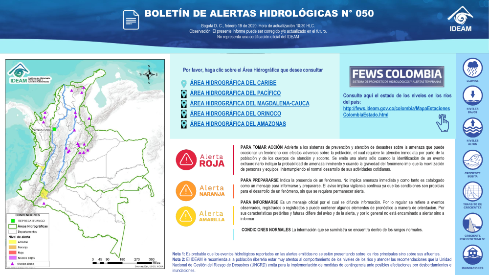 Además, en las cinco vertientes hidrográficas del territorio colombiano el Ideam tiene 834 estaciones hidrológicas (389 limnimétricas y 445 limnigráficas) para suministrar datos sobre el régimen hidrológico de los cauces y cuerpos de agua principales, para hacer seguimiento al proceso de la escorrentía en el ciclo hidrológico y a los eventos extremos asociados. Algunos parámetros se observan dos veces al día, como el nivel del río y la concentración de sedimentos.