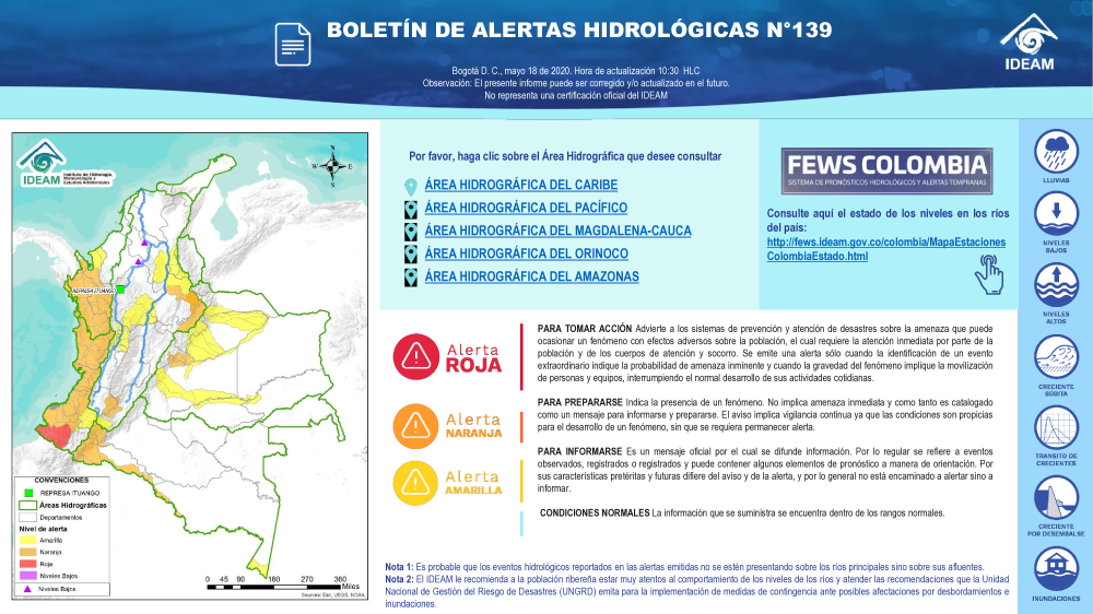 Además, en las cinco vertientes hidrográficas del territorio colombiano el Ideam tiene 834 estaciones hidrológicas (389 limnimétricas y 445 limnigráficas) para suministrar datos sobre el régimen hidrológico de los cauces y cuerpos de agua principales, para hacer seguimiento al proceso de la escorrentía en el ciclo hidrológico y a los eventos extremos asociados. Algunos parámetros se observan dos veces al día, como el nivel del río y la concentración de sedimentos.