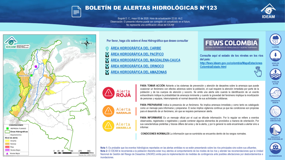 En general, el seguimiento que hace el Ideam del comportamiento hidrológico en los principales ríos del país se realiza con la información horaria en tiempo real que se recibe de las estaciones automáticas, complementadas con más de 40 estaciones hidrológicas que transmiten en las primeras horas cada mañana, los 365 días del año.