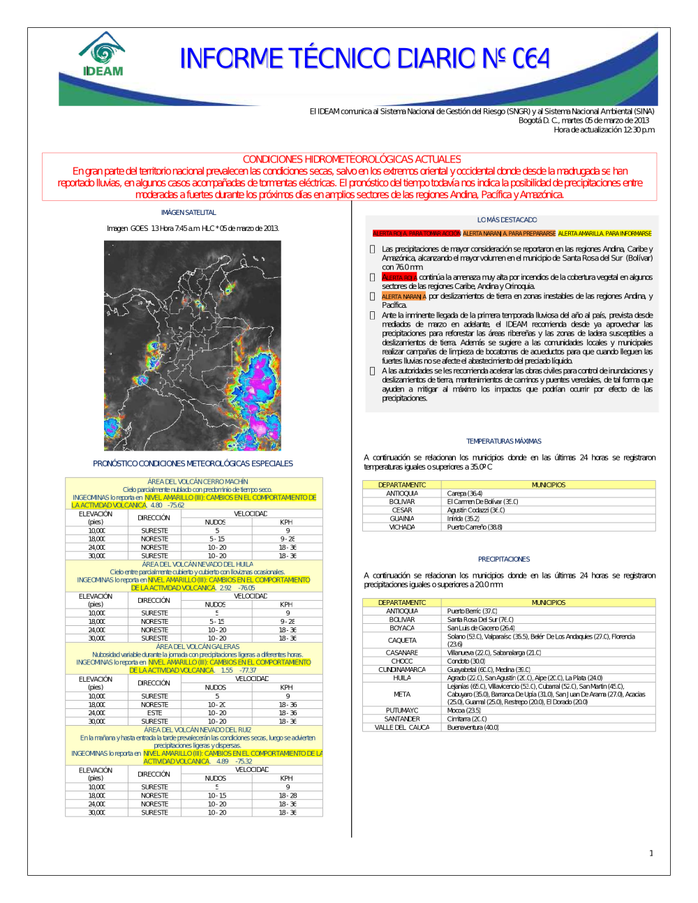El IDEAM, pone a disposición del Sistema Nacional para la Prevención y Atención de Desastres (SNPAD), el Sistema Nacional Ambiental (SINA) y la comunidad en general, el informe técnico diario de alertas ambientales de origen hidrometeorológico; de Igual manera, se pueden consultar los informes anteriores. En caso de eventos extraordinarios que puedan ser detectados por nuestra red ambiental, se publicará un comunicado especial. Se debe tener en cuenta que esta es una información indicativa de orden nacional; para situaciones puntuales favor remitirse a los comunicados que emitan los Comités Locales y Regionales de Prevención y Atención de Desastres.