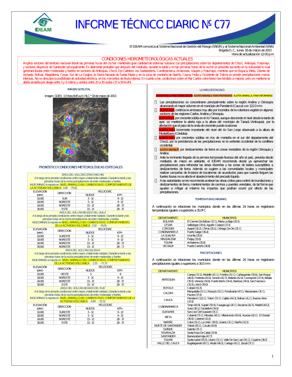 El IDEAM, pone a disposición del Sistema Nacional para la Prevención y Atención de Desastres (SNPAD), el Sistema Nacional Ambiental (SINA) y la comunidad en general, el informe técnico diario de alertas ambientales de origen hidrometeorológico; de Igual manera, se pueden consultar los informes anteriores. En caso de eventos extraordinarios que puedan ser detectados por nuestra red ambiental, se publicará un comunicado especial. Se debe tener en cuenta que esta es una información indicativa de orden nacional; para situaciones puntuales favor remitirse a los comunicados que emitan los Comités Locales y Regionales de Prevención y Atención de Desastres.