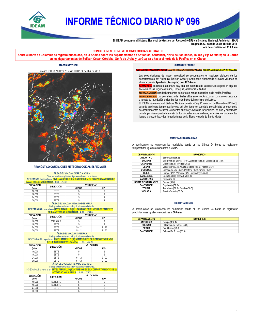 El IDEAM, pone a disposición del Sistema Nacional para la Prevención y Atención de Desastres (SNPAD), el Sistema Nacional Ambiental (SINA) y la comunidad en general, el informe técnico diario de alertas ambientales de origen hidrometeorológico; de Igual manera, se pueden consultar los informes anteriores. En caso de eventos extraordinarios que puedan ser detectados por nuestra red ambiental, se publicará un comunicado especial. Se debe tener en cuenta que esta es una información indicativa de orden nacional; para situaciones puntuales favor remitirse a los comunicados que emitan los Comités Locales y Regionales de Prevención y Atención de Desastres.