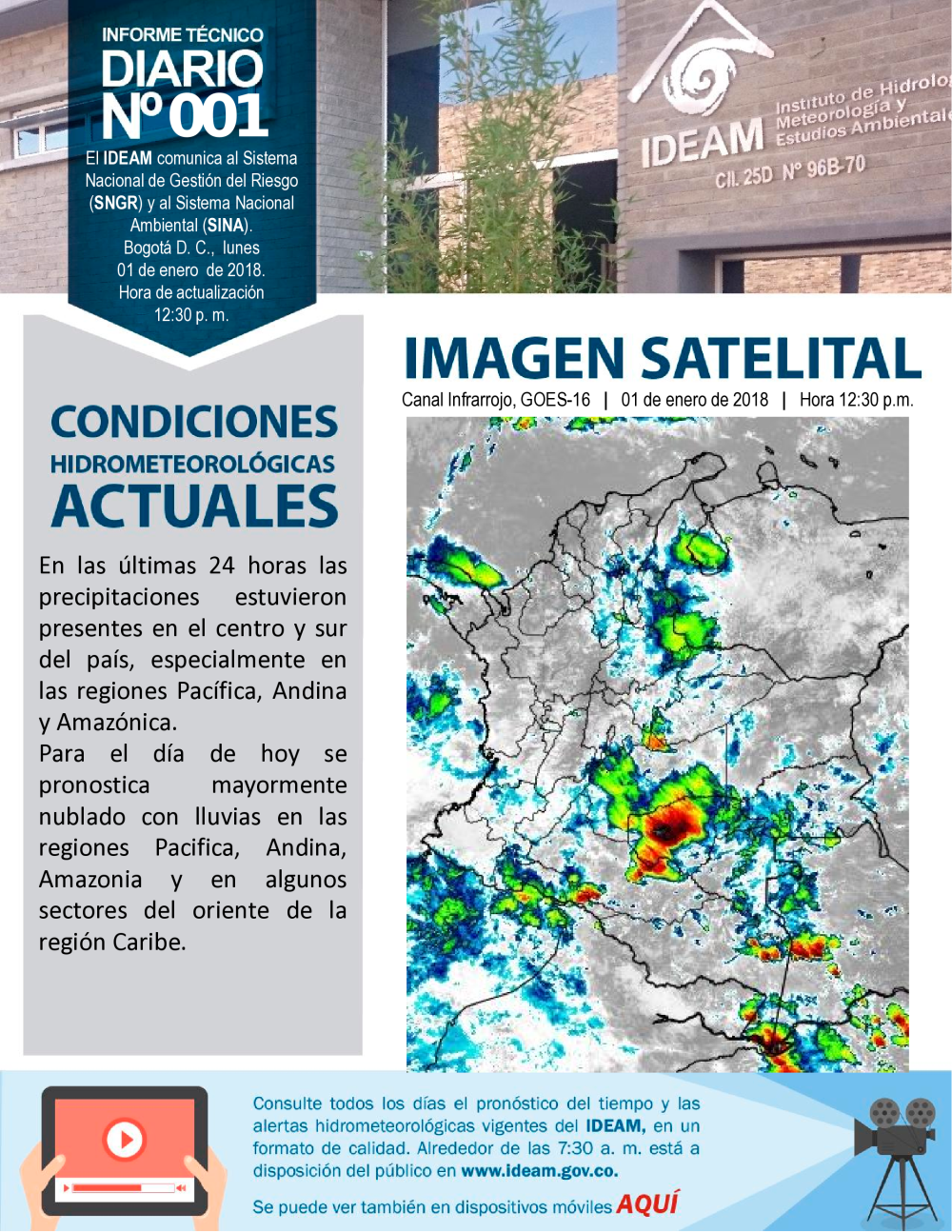 El IDEAM, pone a disposición del Sistema Nacional para la Prevención y Atención de Desastres (SNPAD), el Sistema Nacional Ambiental (SINA) y la comunidad en general, el informe técnico diario de alertas ambientales de origen hidrometeorológico; de Igual manera, se pueden consultar los informes anteriores. En caso de eventos extraordinarios que puedan ser detectados por nuestra red ambiental, se publicará un comunicado especial. Se debe tener en cuenta que esta es una información indicativa de orden nacional; para situaciones puntuales favor remitirse a los comunicados que emitan los Comités Locales y Regionales de Prevención y Atención de Desastres.