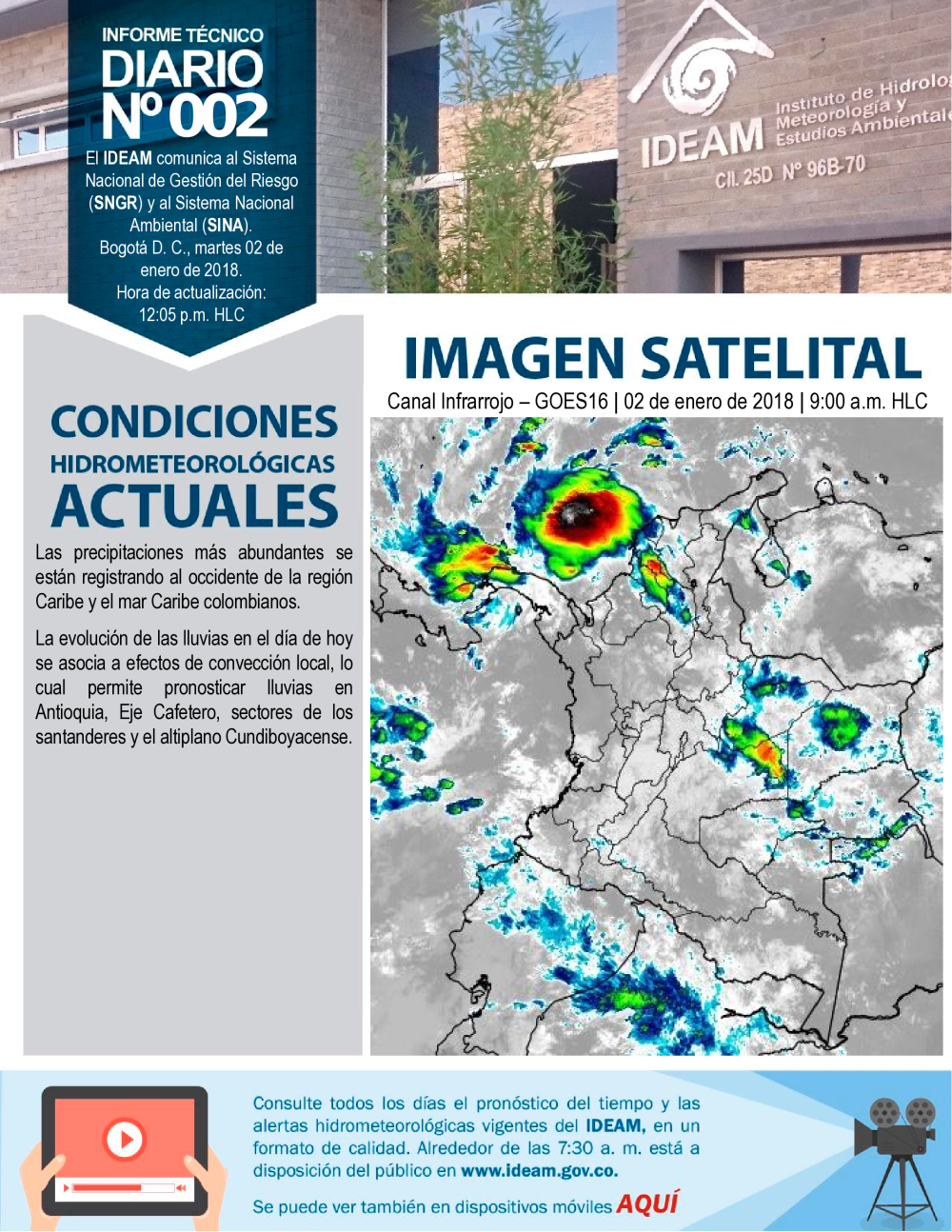 El IDEAM, pone a disposición del Sistema Nacional para la Prevención y Atención de Desastres (SNPAD), el Sistema Nacional Ambiental (SINA) y la comunidad en general, el informe técnico diario de alertas ambientales de origen hidrometeorológico; de Igual manera, se pueden consultar los informes anteriores. En caso de eventos extraordinarios que puedan ser detectados por nuestra red ambiental, se publicará un comunicado especial. Se debe tener en cuenta que esta es una información indicativa de orden nacional; para situaciones puntuales favor remitirse a los comunicados que emitan los Comités Locales y Regionales de Prevención y Atención de Desastres.