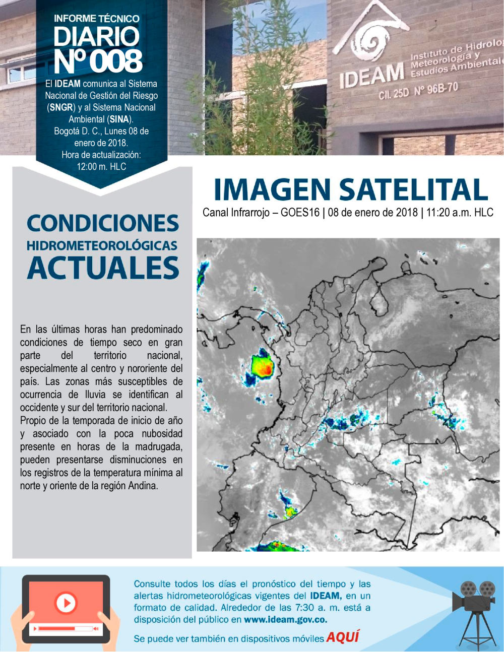 El IDEAM, pone a disposición del Sistema Nacional para la Prevención y Atención de Desastres (SNPAD), el Sistema Nacional Ambiental (SINA) y la comunidad en general, el informe técnico diario de alertas ambientales de origen hidrometeorológico; de Igual manera, se pueden consultar los informes anteriores. En caso de eventos extraordinarios que puedan ser detectados por nuestra red ambiental, se publicará un comunicado especial. Se debe tener en cuenta que esta es una información indicativa de orden nacional; para situaciones puntuales favor remitirse a los comunicados que emitan los Comités Locales y Regionales de Prevención y Atención de Desastres.