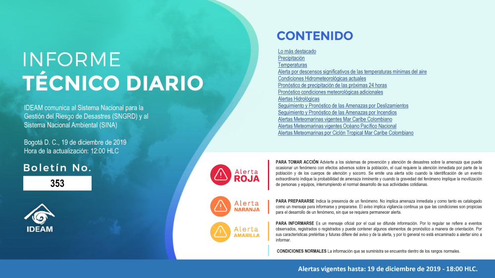 El IDEAM, pone a disposición del Sistema Nacional para la Prevención y Atención de Desastres (SNPAD), el Sistema Nacional Ambiental (SINA) y la comunidad en general, el informe técnico diario de alertas ambientales de origen hidrometeorológico; de Igual manera, se pueden consultar los informes anteriores. En caso de eventos extraordinarios que puedan ser detectados por nuestra red ambiental, se publicará un comunicado especial. Se debe tener en cuenta que esta es una información indicativa de orden nacional; para situaciones puntuales favor remitirse a los comunicados que emitan los Comités Locales y Regionales de Prevención y Atención de Desastres.