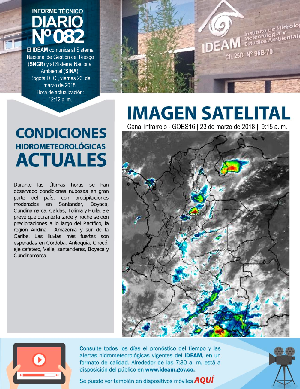 El IDEAM, pone a disposición del Sistema Nacional para la Prevención y Atención de Desastres (SNPAD), el Sistema Nacional Ambiental (SINA) y la comunidad en general, el informe técnico diario de alertas ambientales de origen hidrometeorológico; de Igual manera, se pueden consultar los informes anteriores. En caso de eventos extraordinarios que puedan ser detectados por nuestra red ambiental, se publicará un comunicado especial. Se debe tener en cuenta que esta es una información indicativa de orden nacional; para situaciones puntuales favor remitirse a los comunicados que emitan los Comités Locales y Regionales de Prevención y Atención de Desastres.