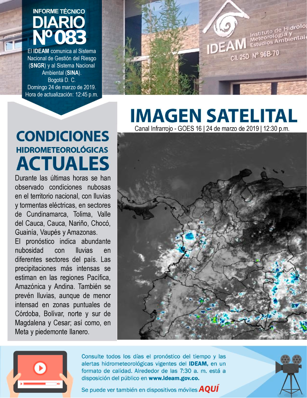 El IDEAM, pone a disposición del Sistema Nacional para la Prevención y Atención de Desastres (SNPAD), el Sistema Nacional Ambiental (SINA) y la comunidad en general, el informe técnico diario de alertas ambientales de origen hidrometeorológico; de Igual manera, se pueden consultar los informes anteriores. En caso de eventos extraordinarios que puedan ser detectados por nuestra red ambiental, se publicará un comunicado especial. Se debe tener en cuenta que esta es una información indicativa de orden nacional; para situaciones puntuales favor remitirse a los comunicados que emitan los Comités Locales y Regionales de Prevención y Atención de Desastres.